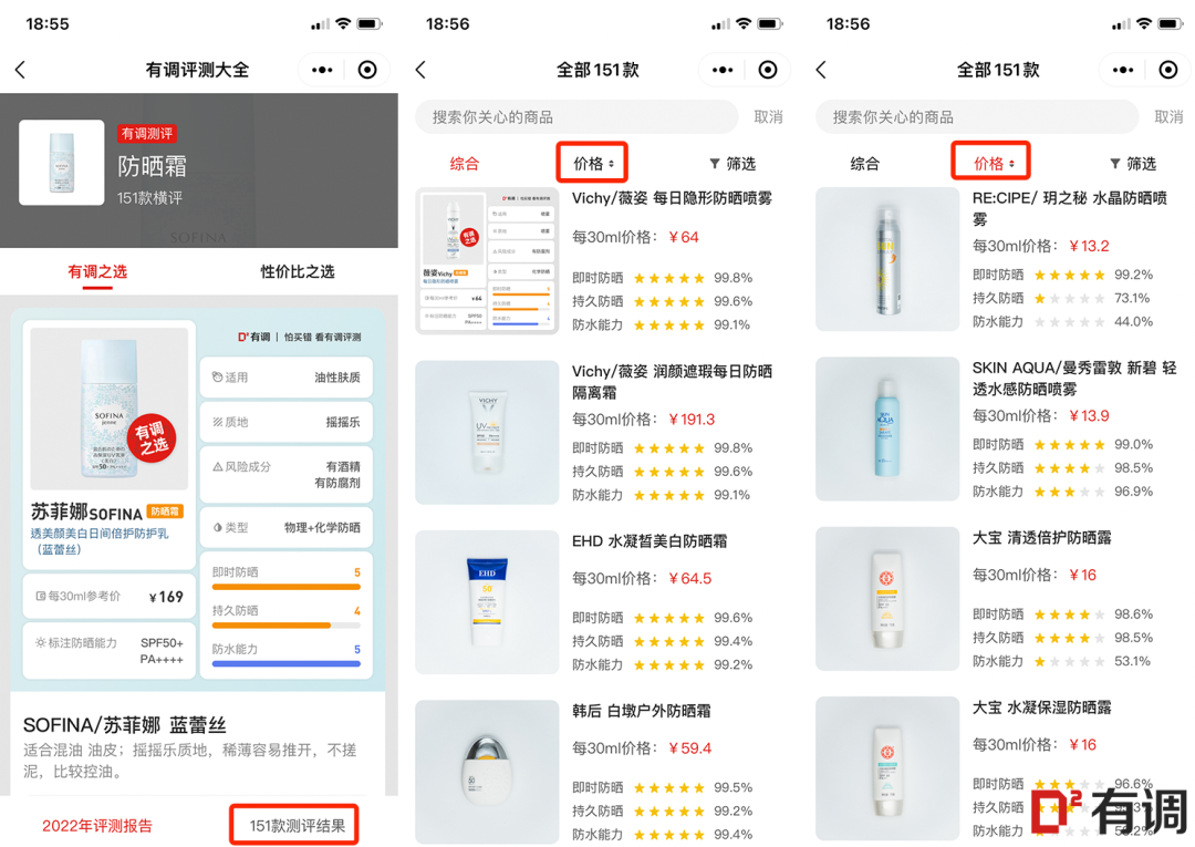 本次所有151款防晒霜的测试结果,都放在“有调评测”小程序里了,支持按照品牌进行搜索,也可以根据即时、持久、防水能力筛选符合要求的防晒霜,还可以按照价格排序(已经统一计算为每30ml/g价格)哦~