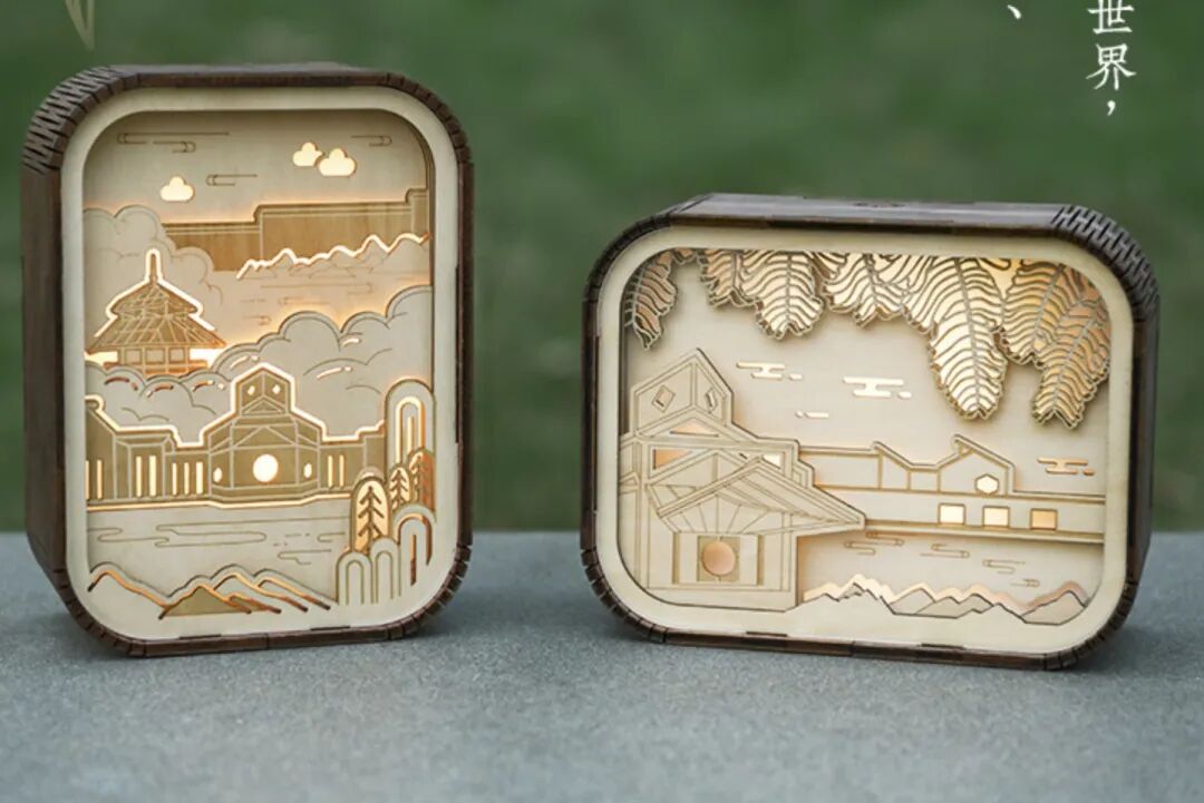 木质小夜灯,灵感来源于苏州博物馆建筑和馆藏《仙山楼阁》图卷,采用解构与重建的方式,汲取苏式园林错落有致的造景手法,多层镂空交叠,立体式地展现了建筑与文物之美。
