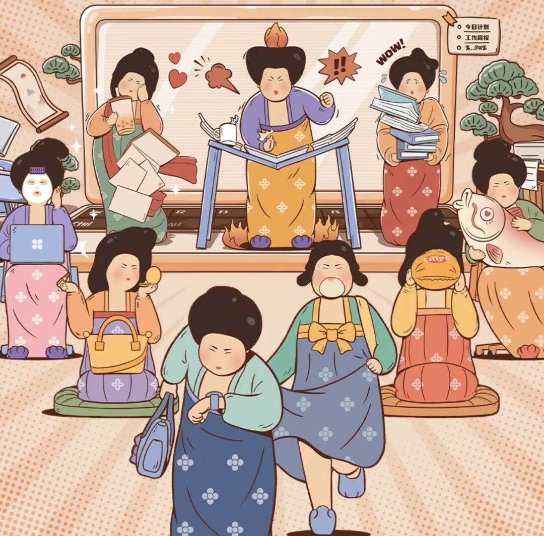唐朝仕女,来到现代社会,也要适应快节奏的生活,逐渐掌握职场打工的秘籍。精致女孩OOTD;奶茶续命,快乐起飞;拒绝加班,反“内卷”;朋克养生,熬夜补水;带薪摸鱼等等,现代打工人的日常,通过仕女形象来展现也是别有一番趣味。