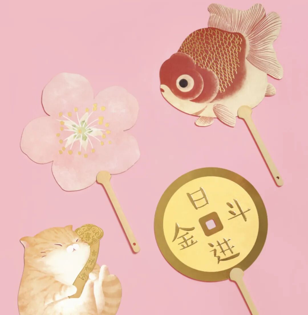 桃花扇——桃花朵朵开,金鱼扇——金鱼满堂好运来,橘猫扇——大橘如意,金币扇——日进斗金,财源滚滚来。都是好兆头,快挑选一个带回家吧~