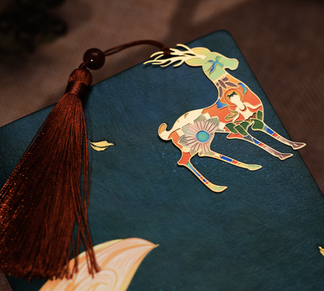极具敦煌文化特色的镂空金属书签,图样选自敦煌壁画的经典元素。“勇敢正直的九色鹿,繁复精致的恶宝相花,听闻飞天奏响笛子音,反弹琵琶的乐舞绝技”,仿佛每一款书签的背后都蕴藏着一段精彩的历史故事。