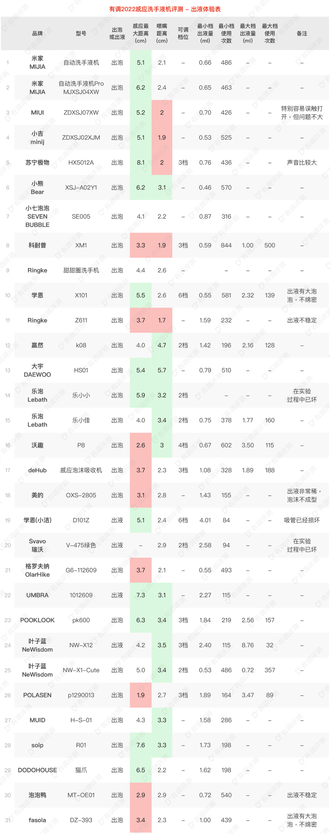 每一款的感应情况、出液量及可用次数情况如下: