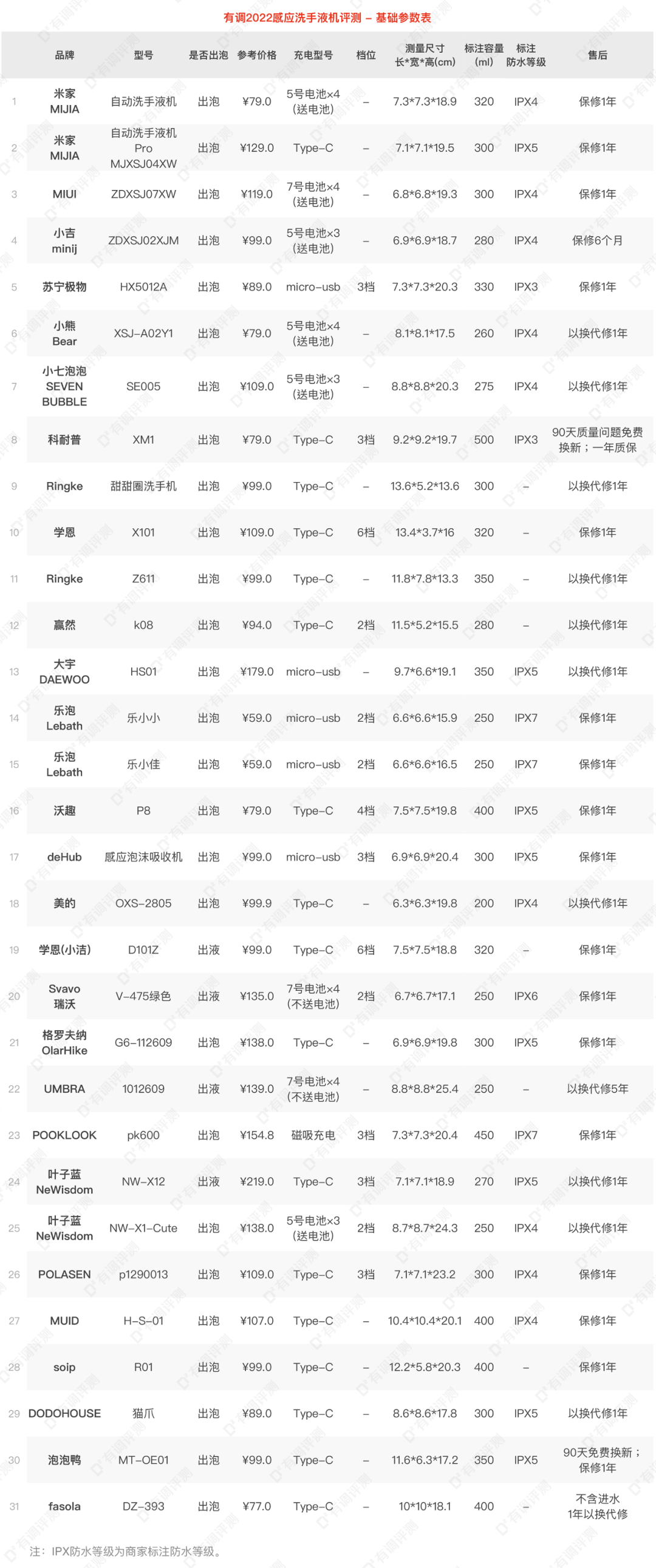由于大部分的洗手液机的防水等级都是IPX4,即防喷溅型不可浸水,评测时间没有日常使用那么长,所以我们没有把感应洗手液机进行浸水实验。采用了商品详情介绍标注的防水等级,不同防水等级代表的含义如下: