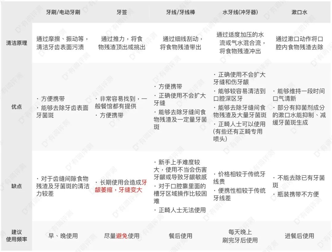 牙齿的损伤都是不可逆的,口腔护理第一步就是要好好刷牙,但刷牙仅能清理牙齿表面的牙菌斑,对于散布在牙齿缝隙和角落里面的食物残渣就需要借助牙线/水牙线来做深度清洁;在用餐后使用漱口水能够保持口气清新,部分添加了抑菌剂的漱口水还能在一定程度上减缓牙菌斑的生长。
