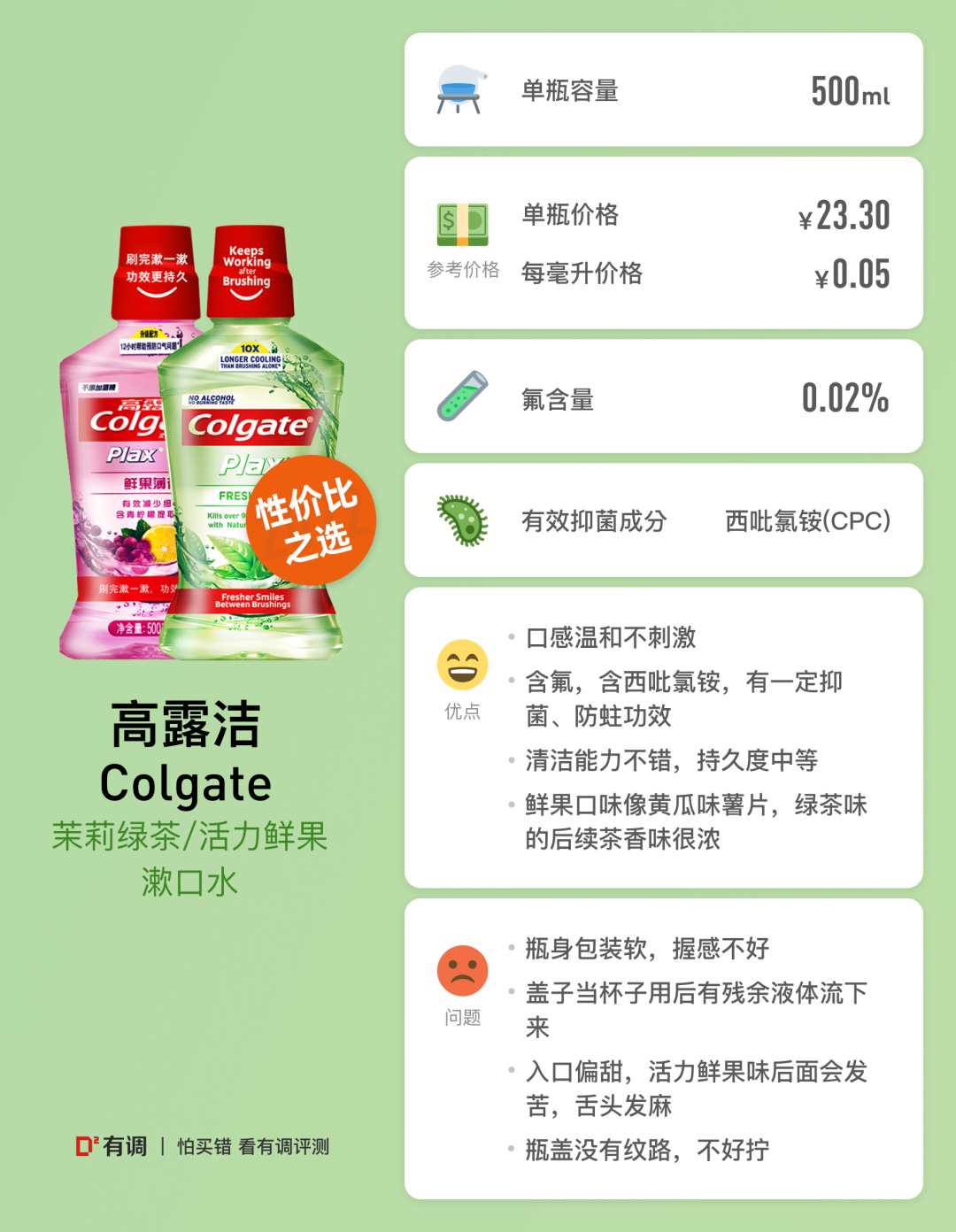 心跳。:这次测评真的是颠覆了我对高露洁的认知,他家的2号选手也是很优秀滴!首先瓶盖包装易撕,徒手拆就可(不像某O2在包装上就要费半天劲),瓶盖设计有点像佳洁士那款:外观上分两层,内部有圈明显分界线。口感很清爽,有点像青瓜味的薯片,不甜也不辣口(我又想喝了。。。) 即时清新效果极佳,持久度不敌“茉莉绿茶”那款,这个大概3小时吧,瑕不掩瑜、瑕不掩瑜,不喜欢太甜的小伙伴一定要考虑它!