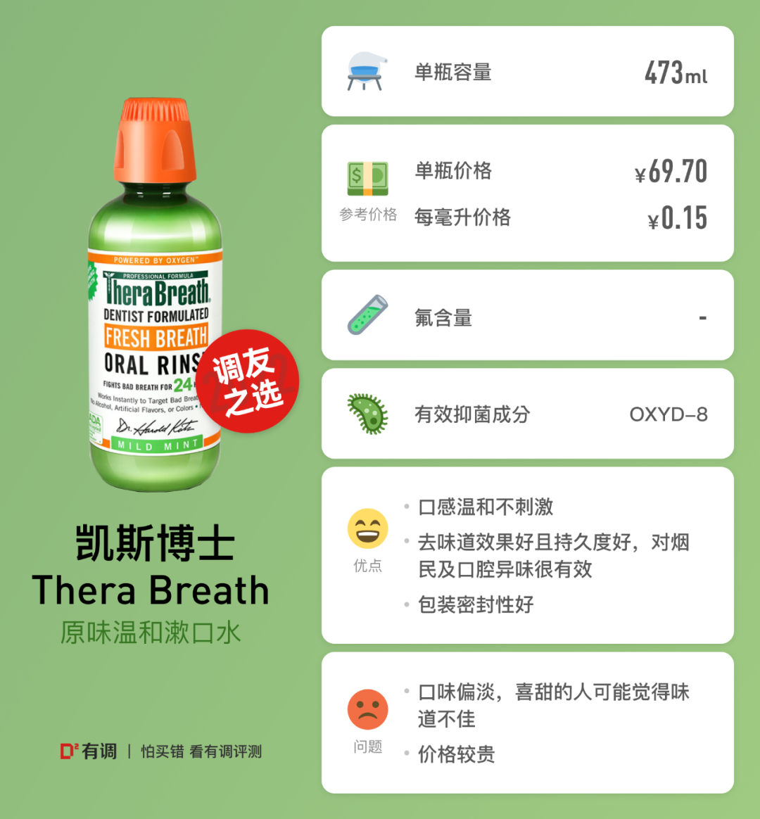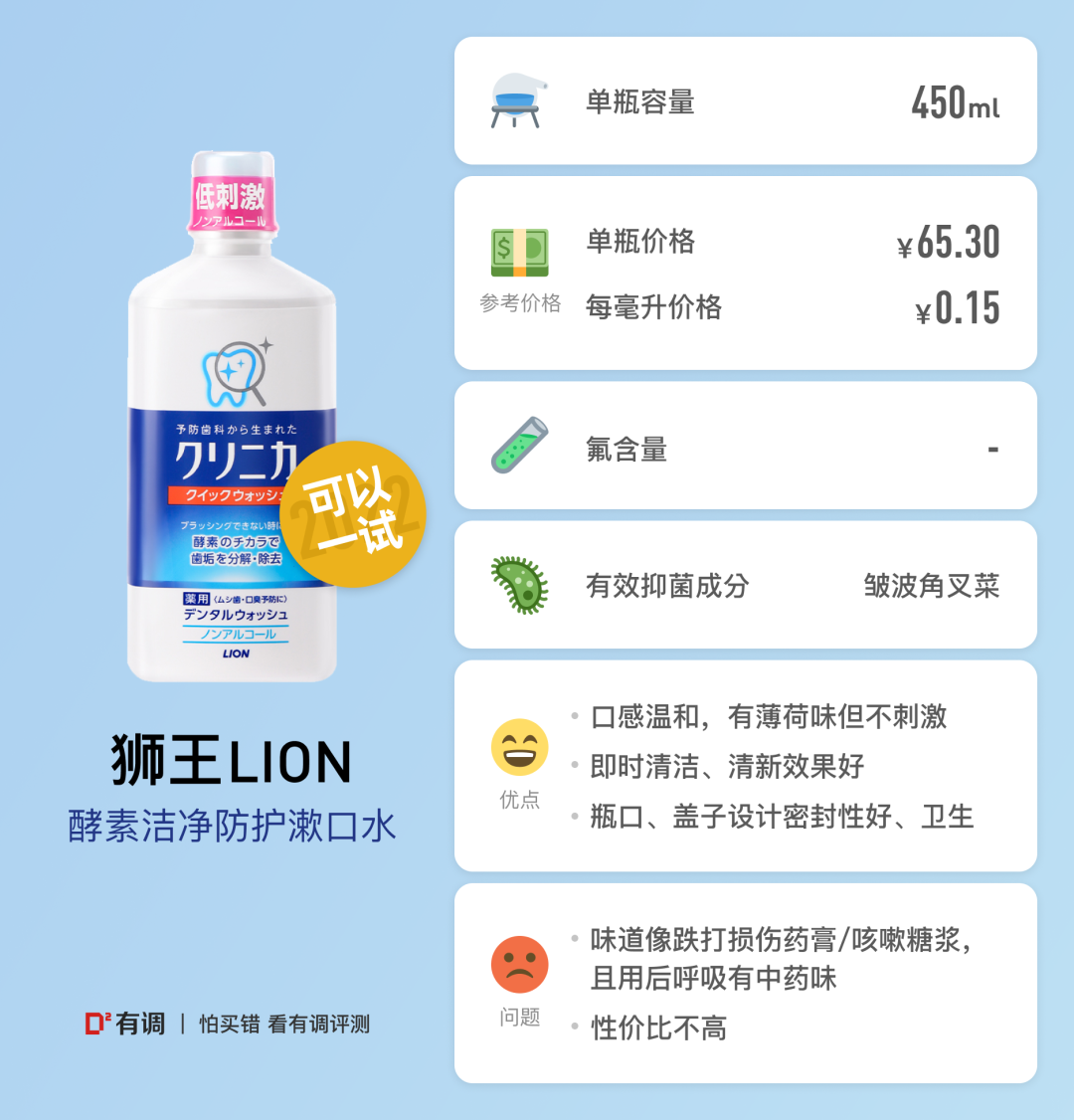 西小贝:1.这款闻起来有一种绿箭薄荷味口香糖的味道,一开始入口是没有辛辣感的,也没有酒精带来的给鼻子的刺激感,这点十分好评。2.漱口全程感觉也很好,只是在吐出来后觉得口中短暂有刺激感,舌头微微发麻,过几秒这种感觉就会消失,没有到需要用清水漱口来缓解的程度(后测试是由于刚吃完大蒜立马漱口的缘故,如果间隔十几分钟再漱口,就没有这种刺激感了)。3.漱完之后嘴里不会觉得涩口,感觉没有破坏原本口腔黏膜。另外,这款漱完后口中残留的感觉也很清新,就像嚼绿箭薄荷味口香糖的味道一样。4.我个人觉得,它的清新程度、口感非常好,在一众漱口水中有一种“清新脱俗”的感觉,好像在传递“我不做各种果味,也不做各种茶味,就是把薄荷的清新感做到极致”的理念,我查了这个牌子是日本的牌子,我觉得比较符合日本做产品的调性。5.我个人是非常喜欢这款的,属于我一定要回购的系列,唯一需要吐槽的就是包装,浓浓的妇炎洁既视感,不过就像凯斯博士一样,好用才是最重要的。