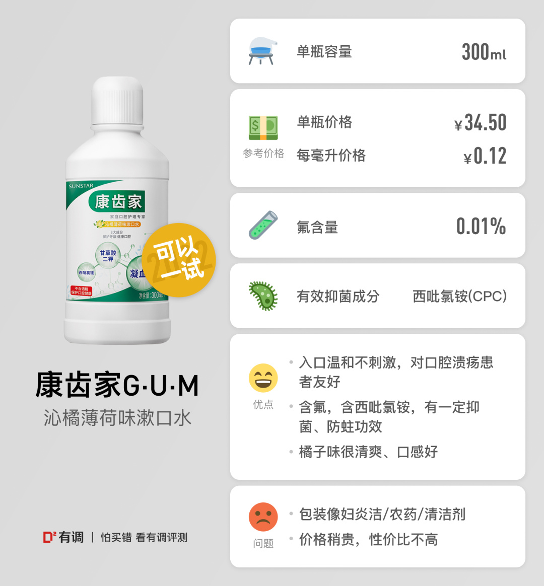 敌子羊:漱口水闻起来像咳药水味道,漱口时也是咳嗽药水味道为主,但入口非常温和,漱口后口中有薄荷香味,无咳嗽药水味道,同时舌头和牙齿有些许滑感,较为清爽,无涩感,味道残留不浓烈。包装上印有(妊娠反应)孕妇可用,这是较为少有的说明。使用后隔夜口腔还有味道,效果持久。总推荐程度:5星