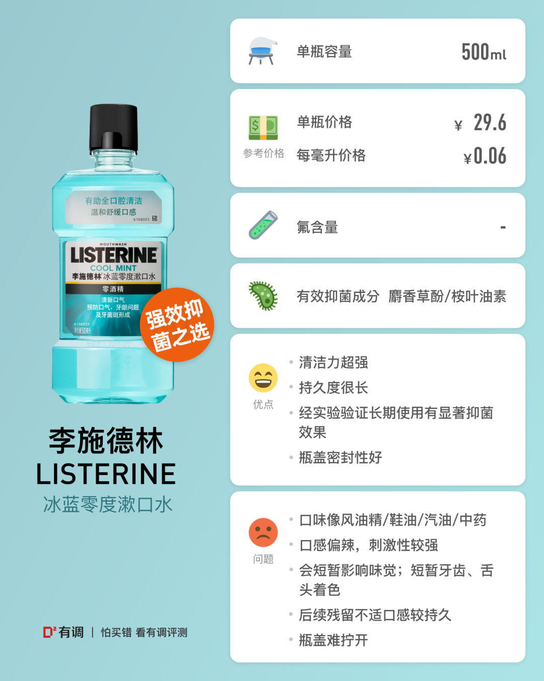 sherryii:1.辣度倒是还好,但是清凉刺激感直冲天灵盖的感觉着实酸爽。李施德林,不愧是你。2.pH值5-6,偏中性。有效抑菌成分桉叶油素等等。李家特有配方。3.小包装,出差旅行可以无脑买来急用。他就像是个异域帅哥,认识一下偶尔见个面就可以了,金屋藏娇居家使用,达咩。