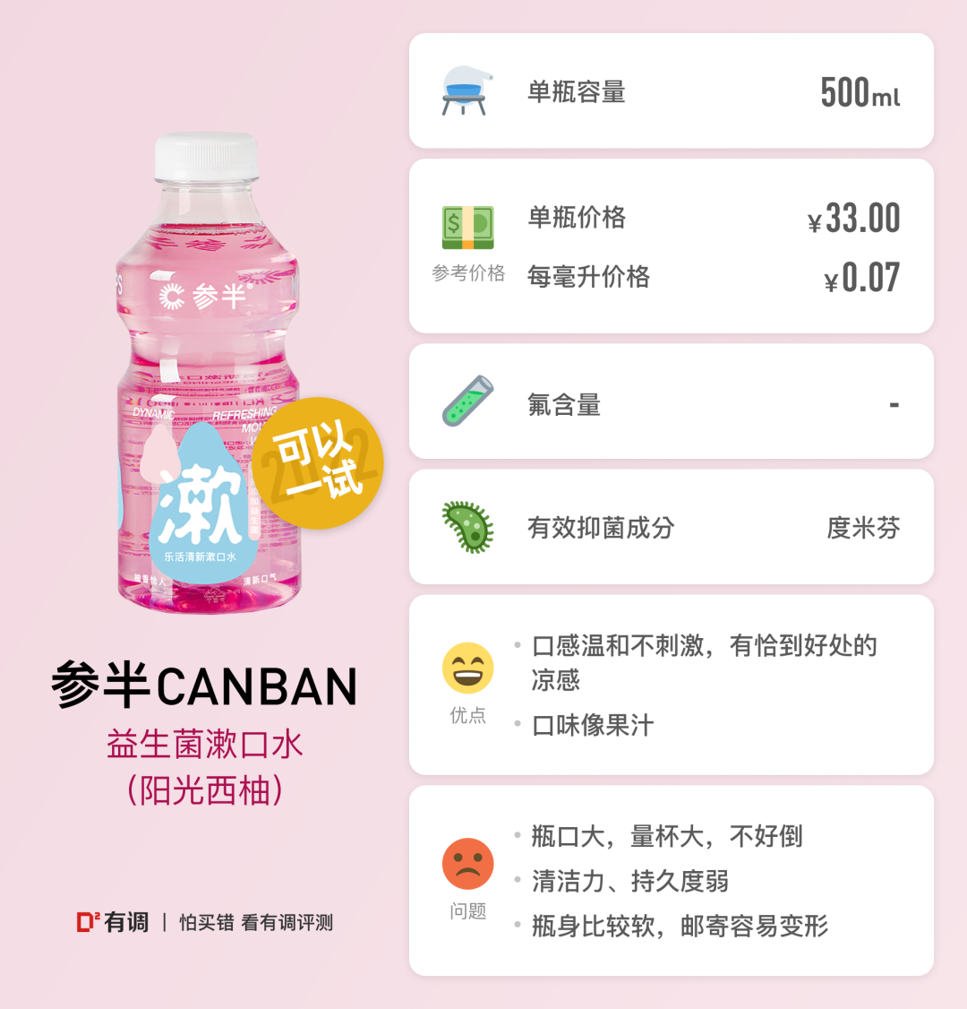 小胡小胡 稀里糊涂:瓶身比较软,优点是单独配有量杯,好评!西柚清香怡人,入口不刺激,甜甜柚子味,像在喝果汁。漱口后残留很香甜,个人不是很喜欢甜甜的口感。即时清新能力和持久度都还不错。颜值香味都可,但有其他选择的话个人不会回购,只能算无功无过的一款漱口水。