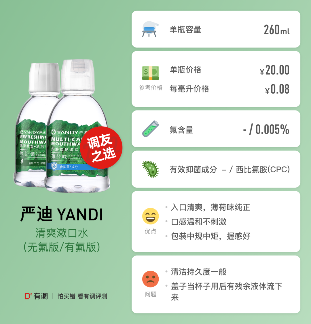 固土百里:入口清爽,不刺激,不含酒精,漱口后有清凉感,有少许刺激,瓶盖少许残留,压制效果一般,喜爱度3分。