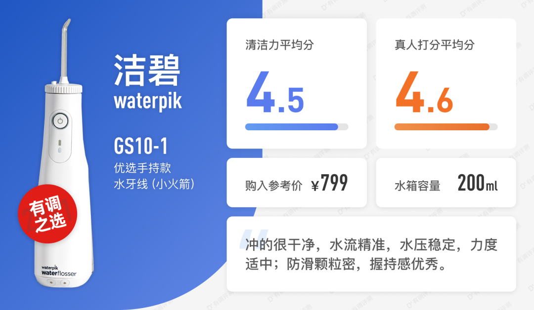 小韦:用过很多品牌的水牙线了,整体来说,洁碧的做工是没得说,防滑设计很友好,水箱聚水设计很加分,基本没什么槽点,可以闭眼入。