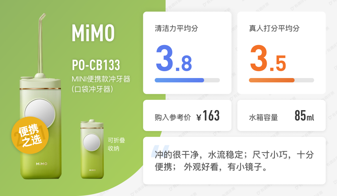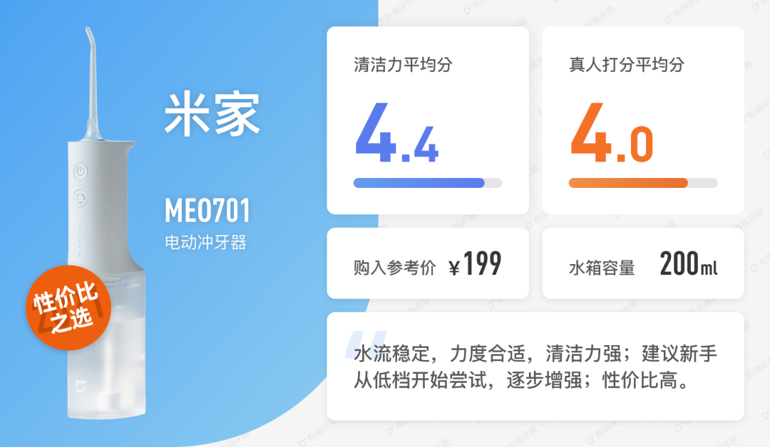 晨阳:米家这款水牙线我用了一个月,握持手感舒适,喷头也比较多,适合各种口腔情况的同学使用。整体而言最大档水流强劲有力而不尖锐,中档柔和舒适冲力也不小,加上方便的换水方式和方便摆放的体积,成为了这个价格段我最喜欢的选手。