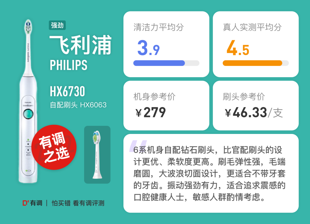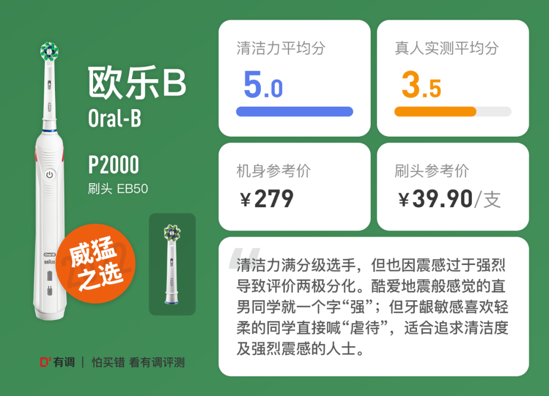 雪姨:清洁能力非常强,刷的时候很享受这种震动,刷完非常有安全感,认为清洁到位了。这个组合我已经用了很多年了,再用其他的都觉得不够力度(除了欧乐B,我不敢试)。