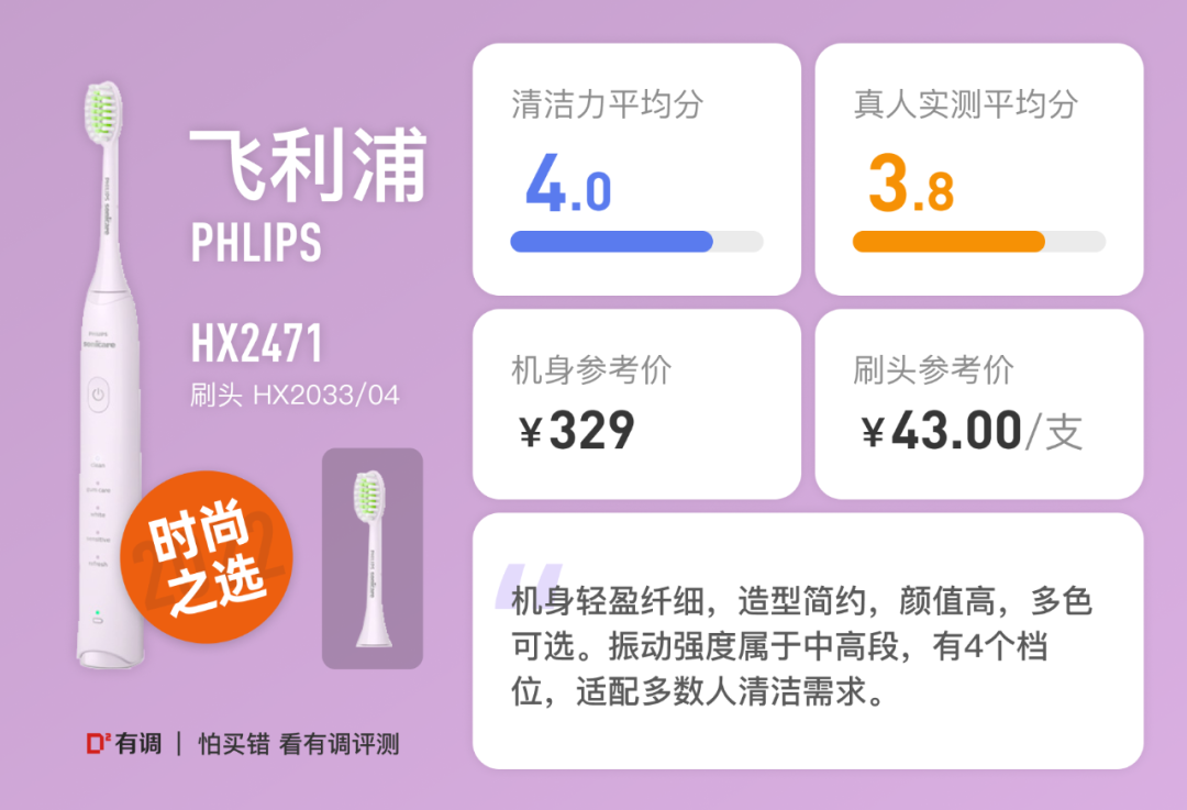 雪姨:首先是颜值,2系的价格买到了9系粉钻的颜值,紫色比粉色甚至更耐看。但是作为飞利浦6系和9系的多年使用者,觉得震动力度不够大,可能适合电动牙刷入门者,或者就是喜欢轻柔力度的朋友。