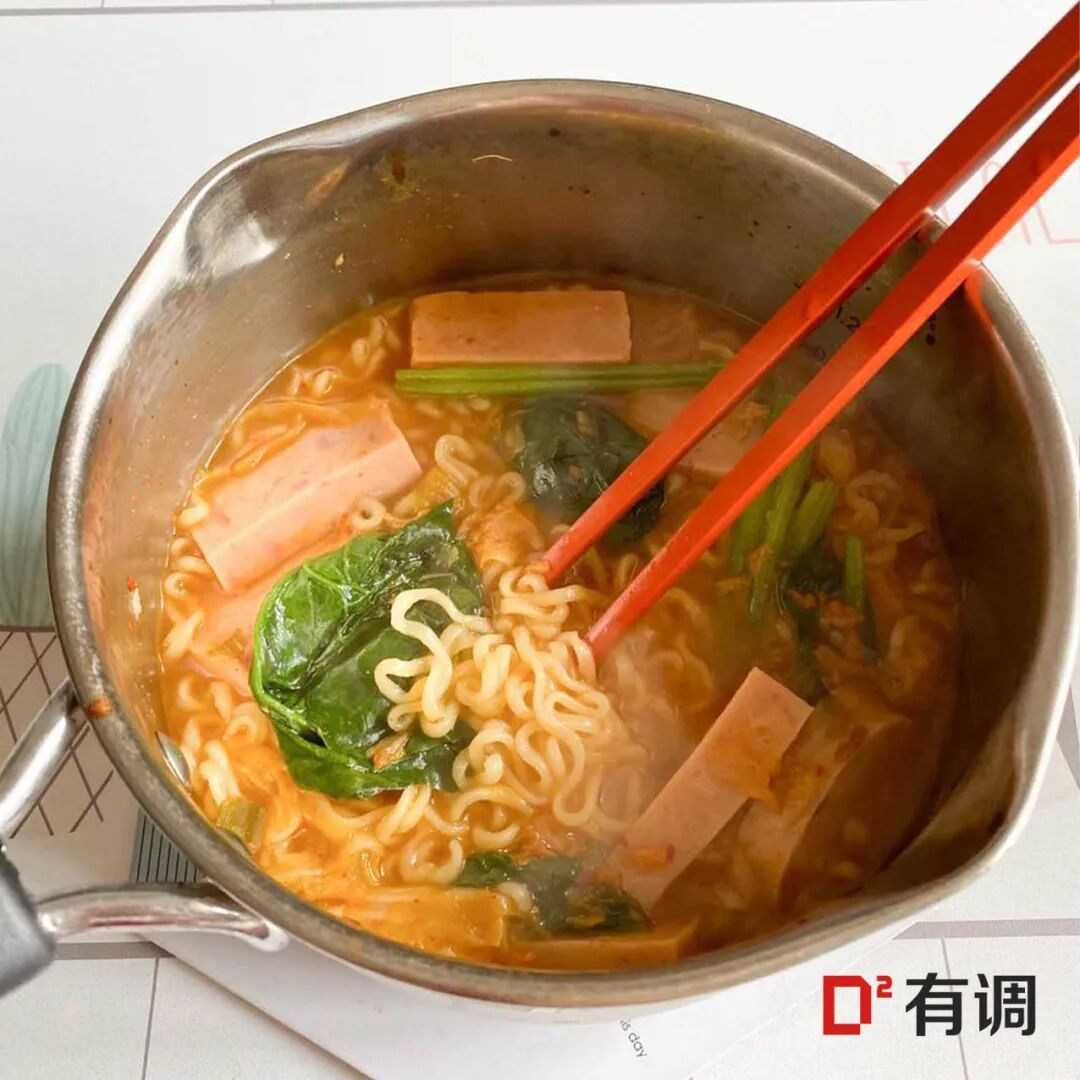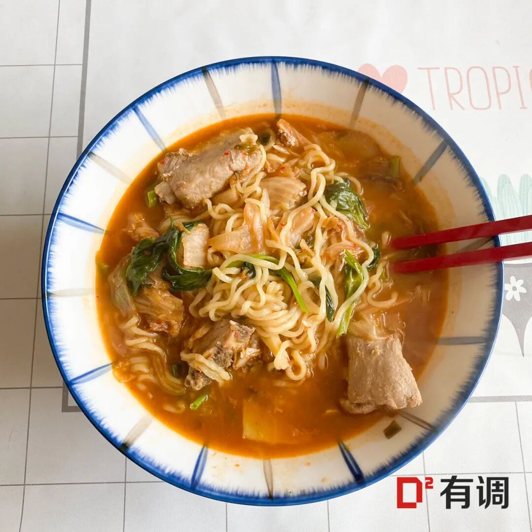 这个辣白菜拉面是需要煮的那种,我个人喜欢再买宗家府的辣白菜再加几片进去,用排骨汤煮或者加点青菜午餐肉,这个拉面特别有嚼劲,煮过以后又特别入味,加进去的辣白菜又脆脆的,吃完就是两个字:满足!