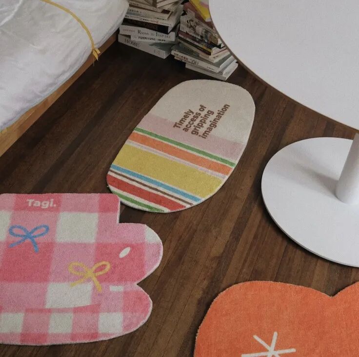 地毯尺寸都不大,适合放在卧室门口、床边、或是小桌子下面。跟其他家具搭配起来也很出彩。它有几款不同造型可选,每一款都可可爱爱。像是格子手套、彩色石头、两个橘子等,冬天在家晒晒太阳,踩在软乎乎的地毯上,不要太惬意哦~
