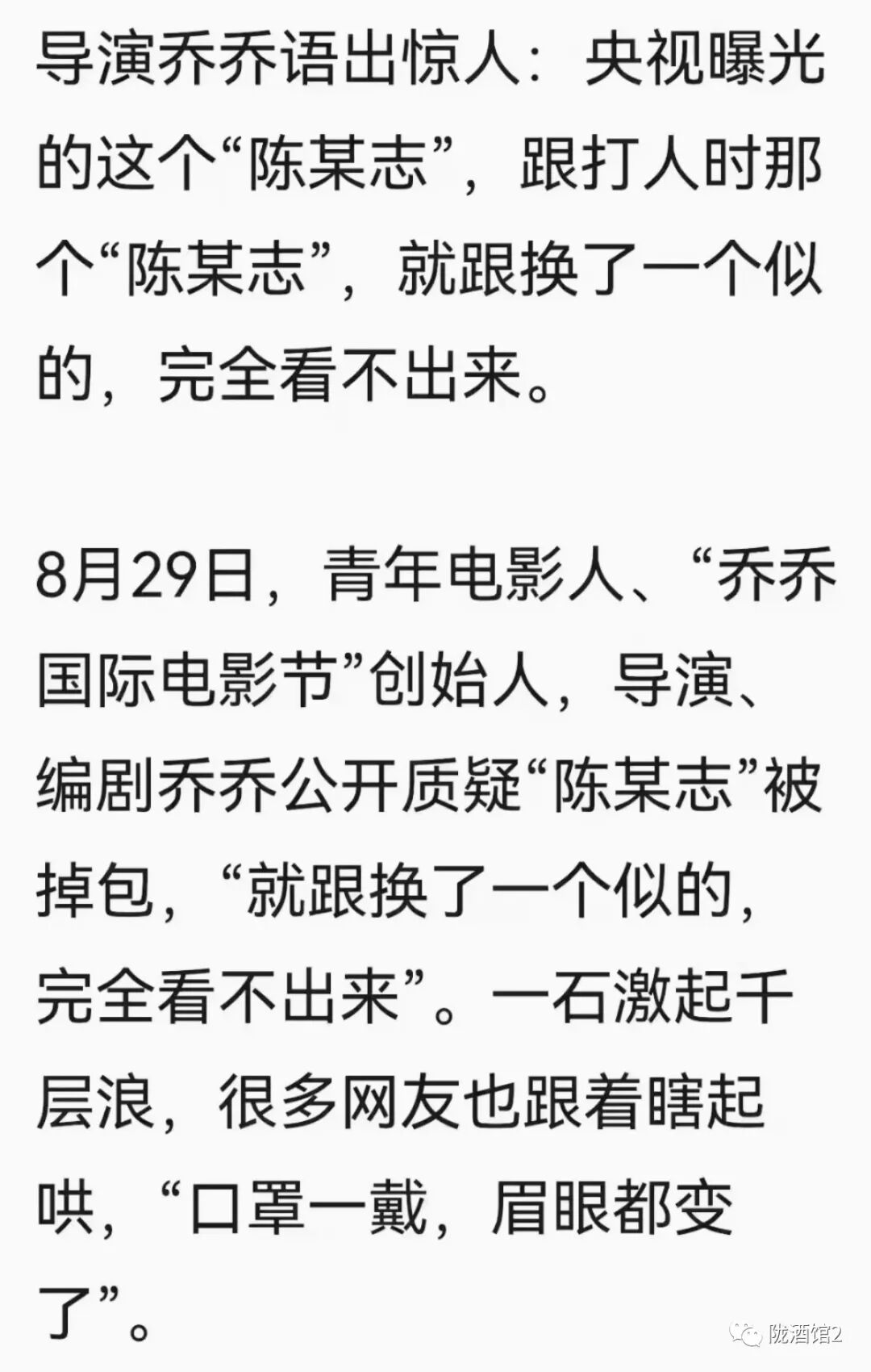 昨天,我在公众号《陇酒馆2》撰文《打假“高衙内”|老狗不死是为贼》,文中发布了三段小视频,可以清晰的对比真假“高衙内”陈某志两者之间的反差,有兴趣的朋友可以点击括弧内的蓝色字体阅读。