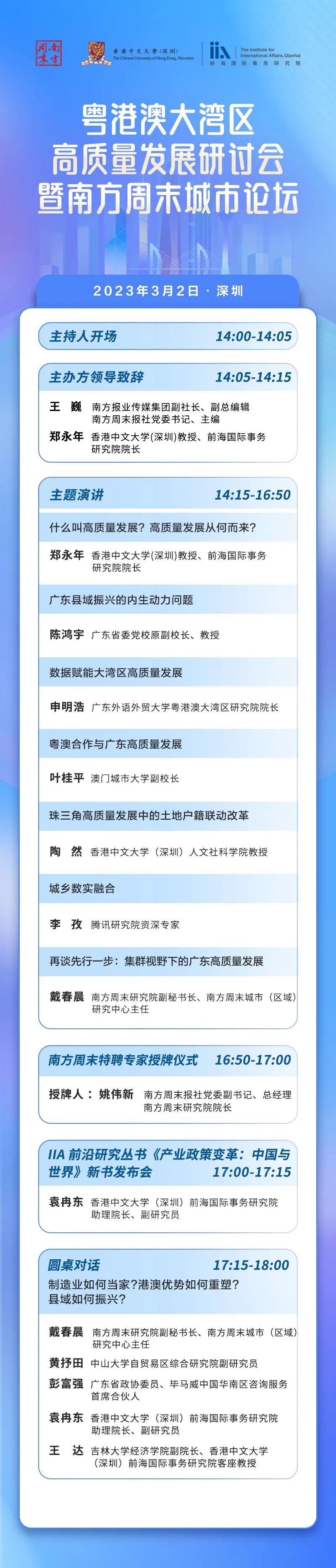 为了解答上述问题,2023年3月2日,南方周末研究院联合香港中文大学(深圳)前海国际事务研究院将共同举办粤港澳大湾区高质量发展研讨会暨南方周末城市论坛,云集学术、媒体、企业等各界优秀代表,共同探索新时期广东高质量发展的新路径。