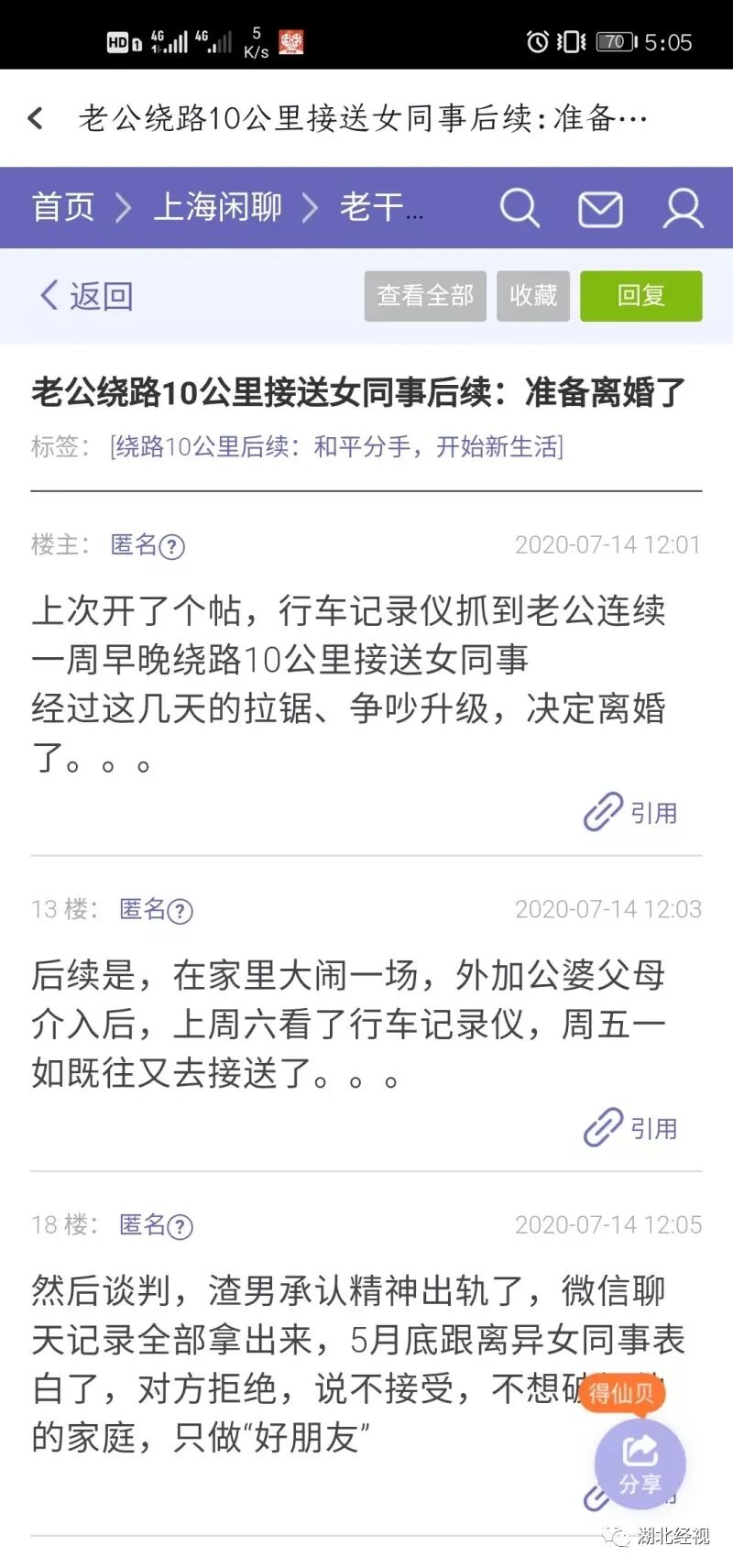 帖子里称,最近一段时间,她总是觉得老公不太一样,可具体那不一样又说不上来。于是她翻老公手机、查通话记录……终于在行车记录仪上看到老公连续一周早晚绕路10公里接送女同事的事实。 于是,她和老公吵了起来,老公却说这个女同事生病了,甲状腺癌,自己很同情她,才会在她身体虚弱的这段时间照顾她。因为这个男人曾经也得过甲状腺癌,做了手术后需要终生吃药,而且在生活中还有很多禁忌,两个人有了共同的话题,便开始惺惺相惜。 因为这件事,两个人开始了拉锯战,争吵升级到冷战,再到提出离婚,最后公婆父母都介入了,老公无奈之下答应不接送了。后来她偷看老公手机,发现没有了两人的聊天记录,但不清楚是不是特地删掉了,可看了行车记录仪,发现自己的老公还是一如既往地又去接送了。更令她震惊的是,老公承认精神出轨,5月底和那位离异女同事表白了,对方拒绝了说不想破坏他的家庭,只做“好朋友”。