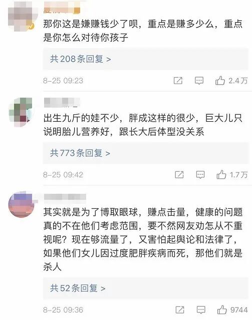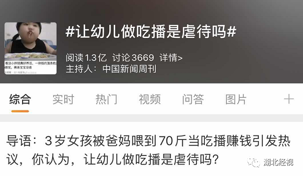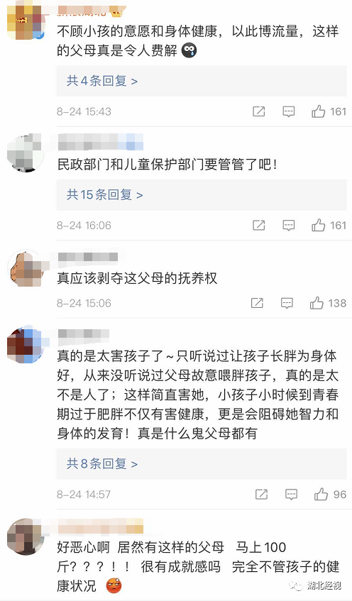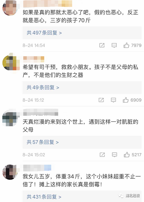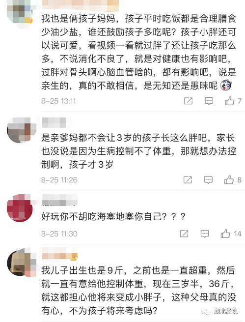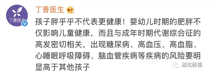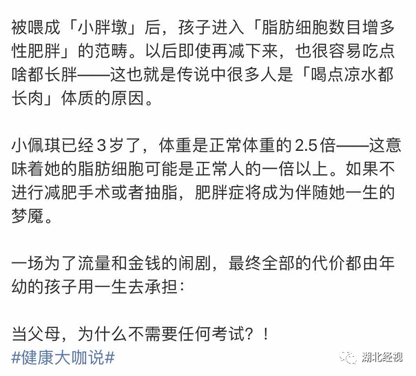 研究表明:三高、脂肪肝等30种疾病,都与婴儿期的肥胖有关。而对女孩来说,危害还远不止这些……成年后,月经不调、多囊卵巢综合征、乳腺癌的概率要比常人高很多。除了生理,精神上的影响也不可小觑。动作笨拙,反应迟钝,上学后很有可能成为同学逗乐甚至是讥讽的对象。畸形吃播,延伸到孩子身上,刻意吃到孩子无法承受,体重超过发育曲线太多,不是美观问题,是孩子肥胖高血压糖尿病心脑血管病… 的伏笔。每个家庭有自己的情况,父母永远有选择,但孩子没选择。被过度消费的童年,长大又该何去何从?别用畸形的娱乐,埋葬孩子快乐的童年。来源:湖北经视综合新浪微博、红星新闻、沸点视频、网络等