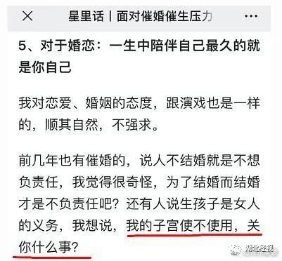 秦岚在接受采访时谈及对于婚恋的看法,“前几年也有催婚的,说人不结婚就是不想负责任,我觉得很奇怪,为了结婚而结婚才是不负责任吧?她还霸气回怼了“生孩子是女人的义务”的说法,表示:“我的子宫使不使用,关你什么事?”