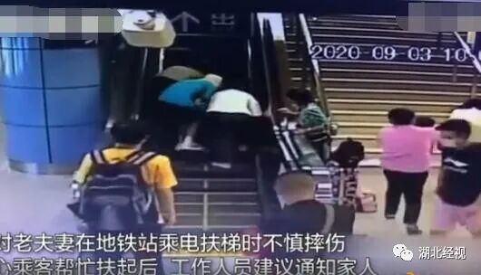 前两天,南京两位七旬老人在地铁站乘坐电扶梯时,不慎摔倒,两位老人都站不起来,热心乘客立即上前搀扶。