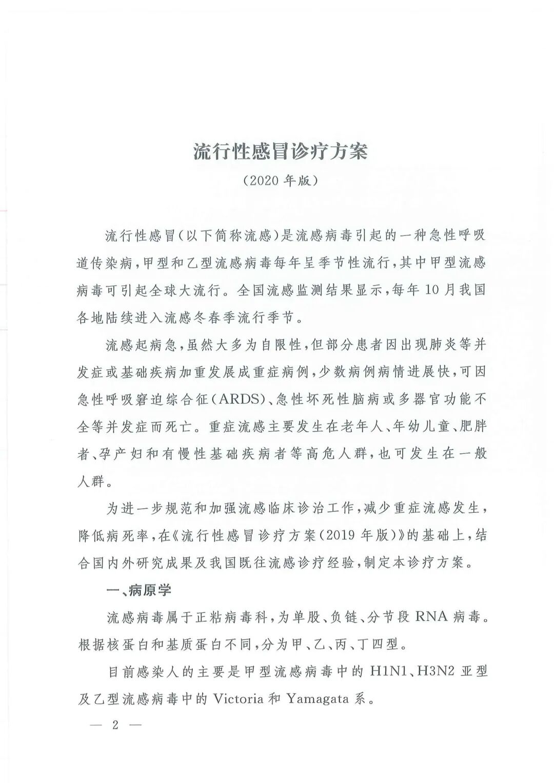 关于印发流行性感冒诊疗方案(2020年版)的通知