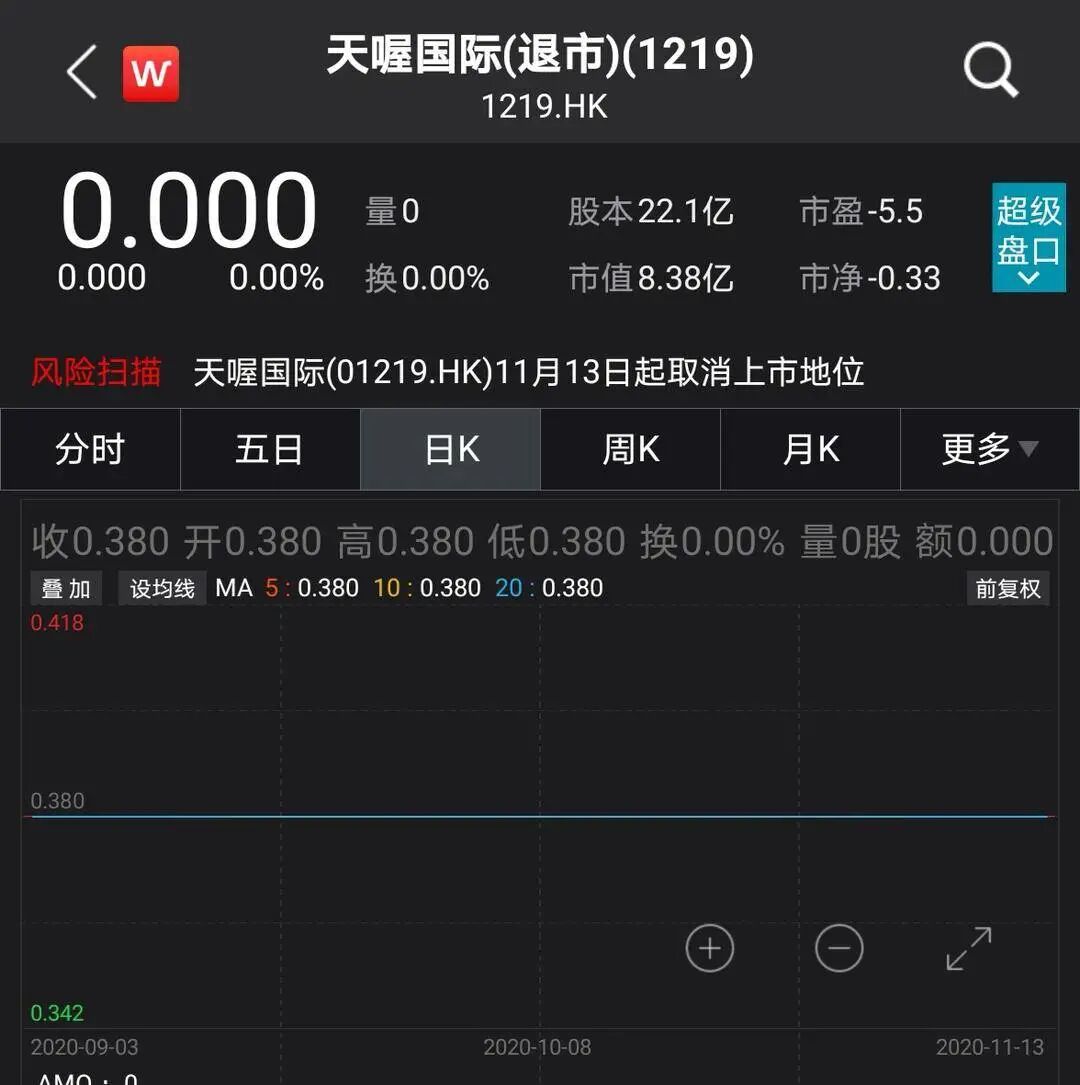 天喔国际自2018年8月13日起已停牌。停牌前,天喔国际已沦为“仙股”,股价只有0.38港元,而其最高股价曾为3.517港元。