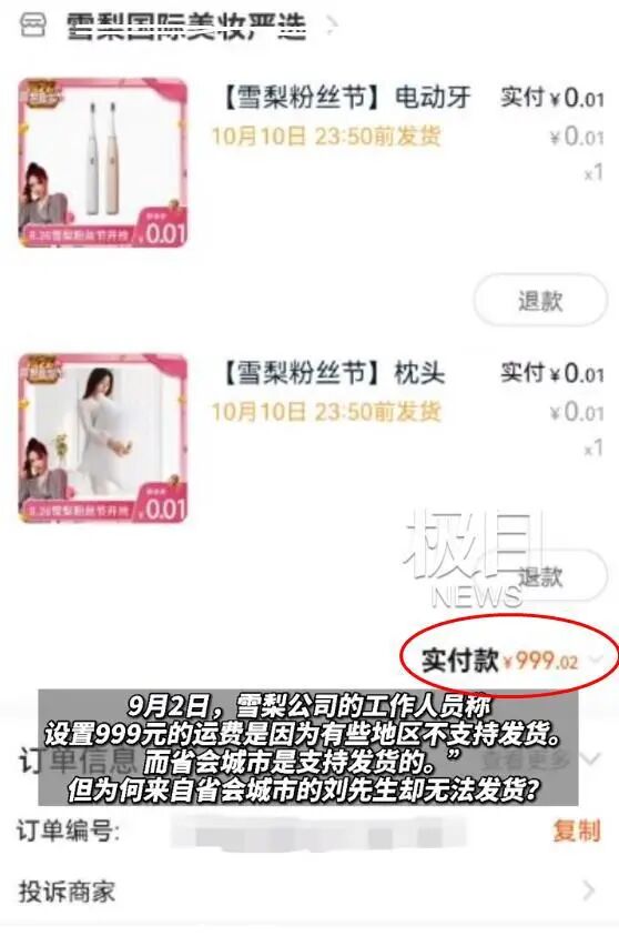 近日,极目新闻报道,一位来自河北石家庄的刘先生称自己在雪梨的直播间进行秒杀抢购,成功抢到了1分钱的电动牙刷和枕头。这本来是件幸运的事。但没想到刘先生下单后,一看订单却有点傻眼,这两个1分钱的东西,运费竟然高达999元。