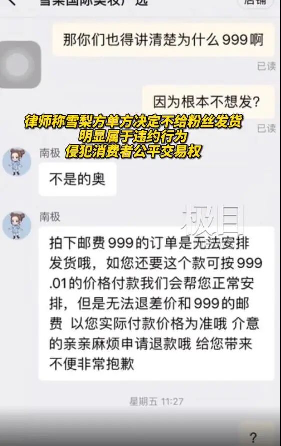 刘先生联系了雪梨店铺,客服先是称他所在的地区为不发货地区,如果消费者需要该商品,那么支付999元邮费才能正常安排发货。