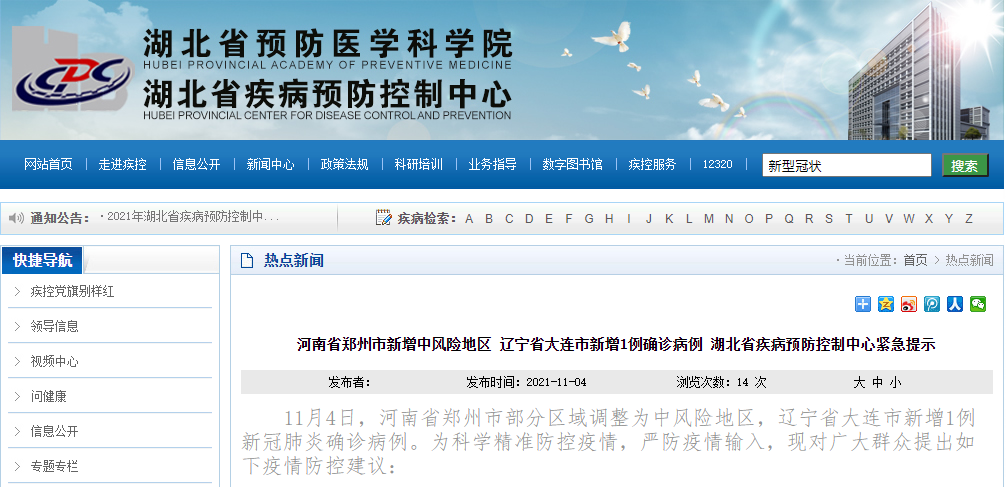 11月4日,河南省郑州市部分区域调整为中风险地区,辽宁省大连市新增1例新冠肺炎确诊病例。为科学精准防控疫情,严防疫情输入,湖北省疾病预防控制中心发布紧急提示: