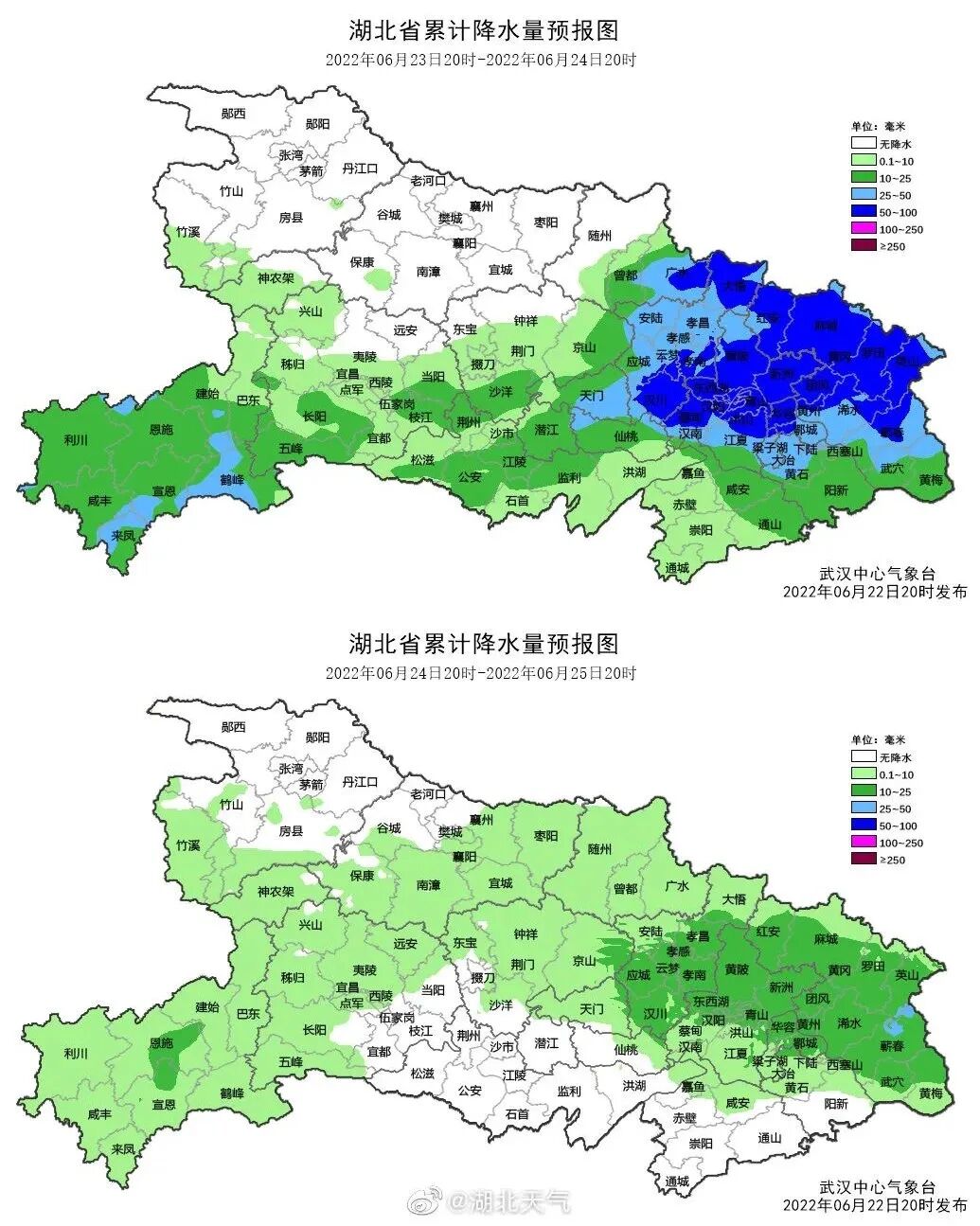 预计6月23日至24日,湖北省自北向南有中到大雨,局部暴雨或大暴雨,强降水中心主要位于随州、孝感、武汉、黄冈、鄂州、恩施等地,上述地区累计雨量40~80毫米,局部100毫米以上,最大小时雨强50~70毫米,局部阵风可达8~11级。