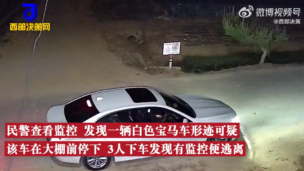 民警查看公共视频,发现一辆白色宝马车在大棚前停下,3人下车发现有公共视频便逃离。随后该车又返回,来到未安装公共视频的大棚实施盗窃。