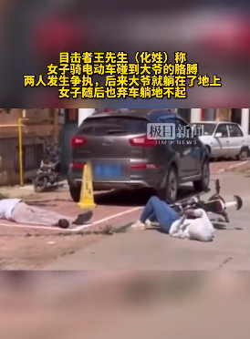 王先生说,事情起因是女子骑电动车碰到了大爷的胳膊,两人发生争执,后来大爷就躺在了地上,女子随后也弃车躺地不起。
