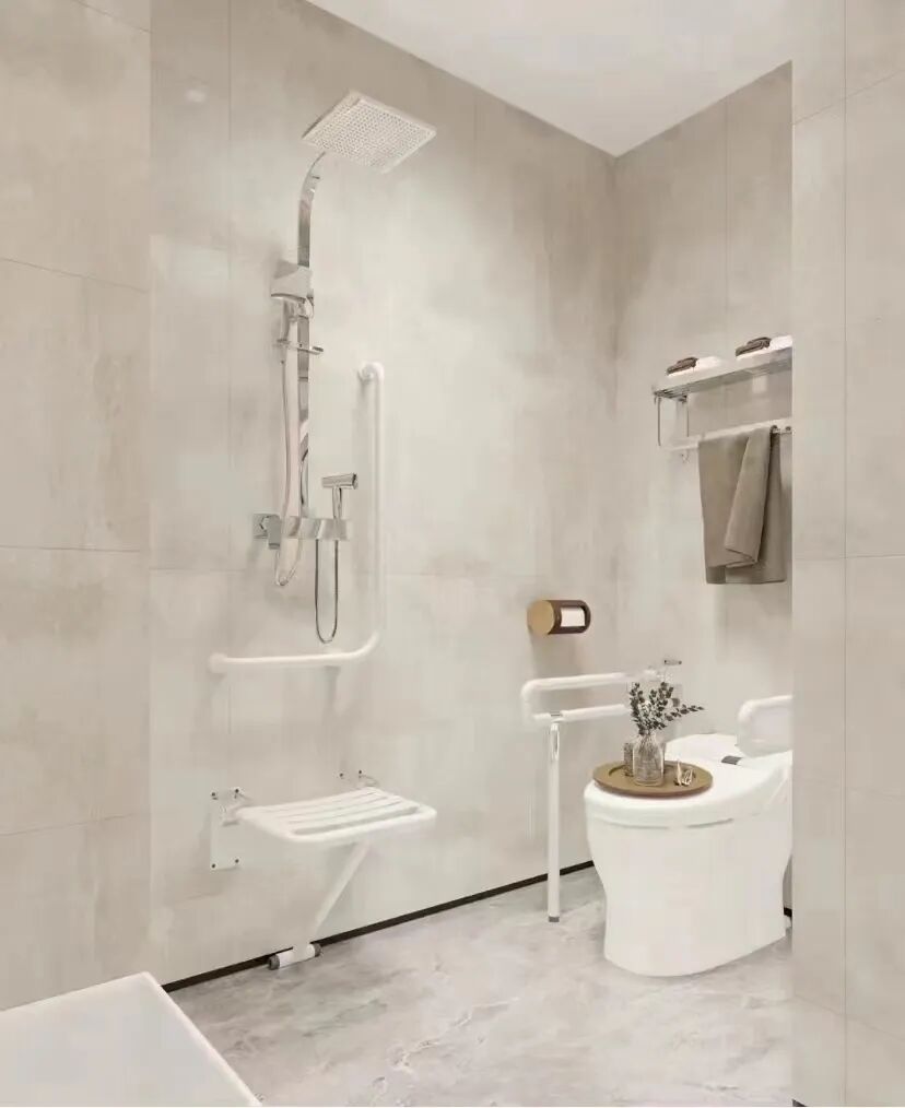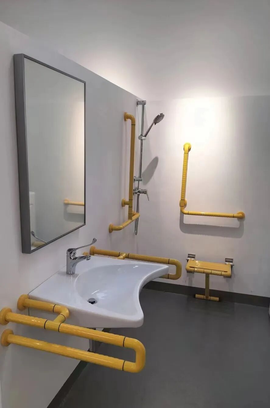 从公共区域的防滑地板,水平扶手,防撞条,到房间的护理床,再到卫生间的助力扶手,洗澡椅……