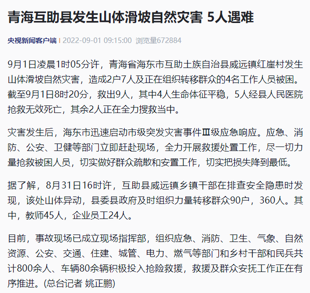 9月1日凌晨1时05分许,青海省海东市互助土族自治县威远镇红崖村发生山体滑坡自然灾害,造成2户7人及正在组织转移群众的4名工作人员被困。截至9月1日8时20分,救出9人,其中4人生命体征平稳,5人经县人民医院抢救无效死亡,其余2人正在全力搜救当中。