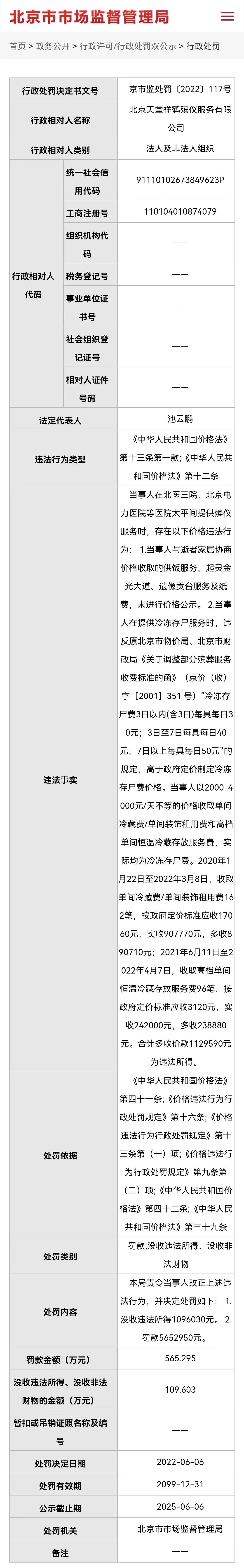 记者从北京市市场监管局网站了解到,曾为北医三院、北京电力医院等医院太平间提供殡仪服务的北京天堂祥鹤殡仪服务有限公司,因价格违法,被没收违法所得109万余元,罚款565万余元。