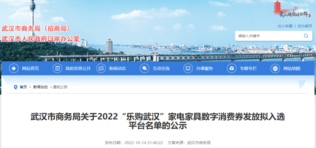 武汉市商务局信息显示,该市拟于2022年“双11”期间,开展2022“乐购武汉”家电家具数字消费券发放工作。10月12日,该市商务局组织召开了征选专家评审会,申请报名参加该项消费券发放活动的平台企业参加了现场评审答辩。最终,确定中国银联股份有限公司湖北分公司(云闪付)、武汉京东金德贸易有限公司(京东)2家平台为该种消费券发放拟入选平台。