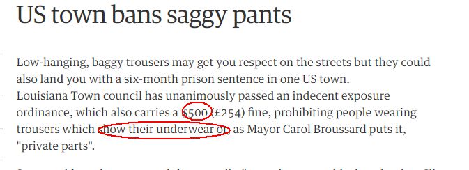 2007年,路易斯安娜州的德尔坎伯镇议会全票通过一项决议,穿裤子露内裤是猥亵行为,违者要重罚500美元。