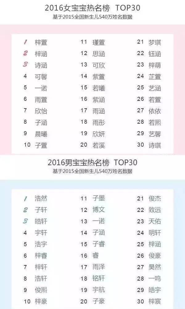 在2016年统计的540万新生儿名字里,前30个男女孩儿热名都极为文艺,“梓”“涵”“子”“轩”这种半文半白的词是家长取名最爱。
