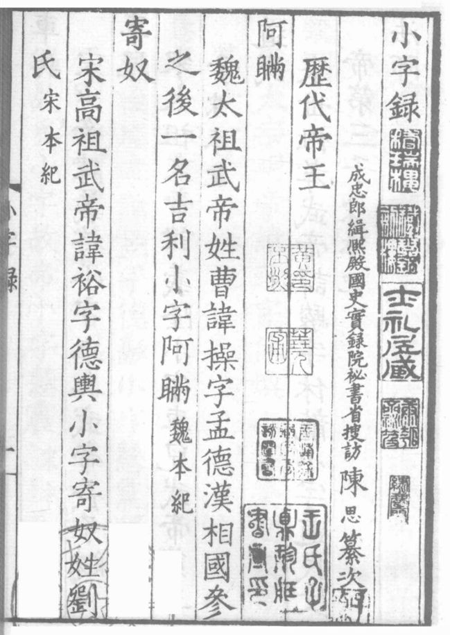 虽然长大了听见别人叫自己的小名会有点羞耻,但爹妈之意不由儿,取小名越来越流行,成为上至天子下至百姓的一项全民活动。魏晋南北朝时期的史书和文学作品中,用小名记载的人物越来越多。唐代开始甚至有人专门为了研究小名写书,陆龟蒙编纂的《小名录》就记载了从秦到南北朝时期一些知名人物的小名。宋代的陈思觉得《小名录》太乱不行,又按照帝王和朝代分类重新整理了《小字录》……