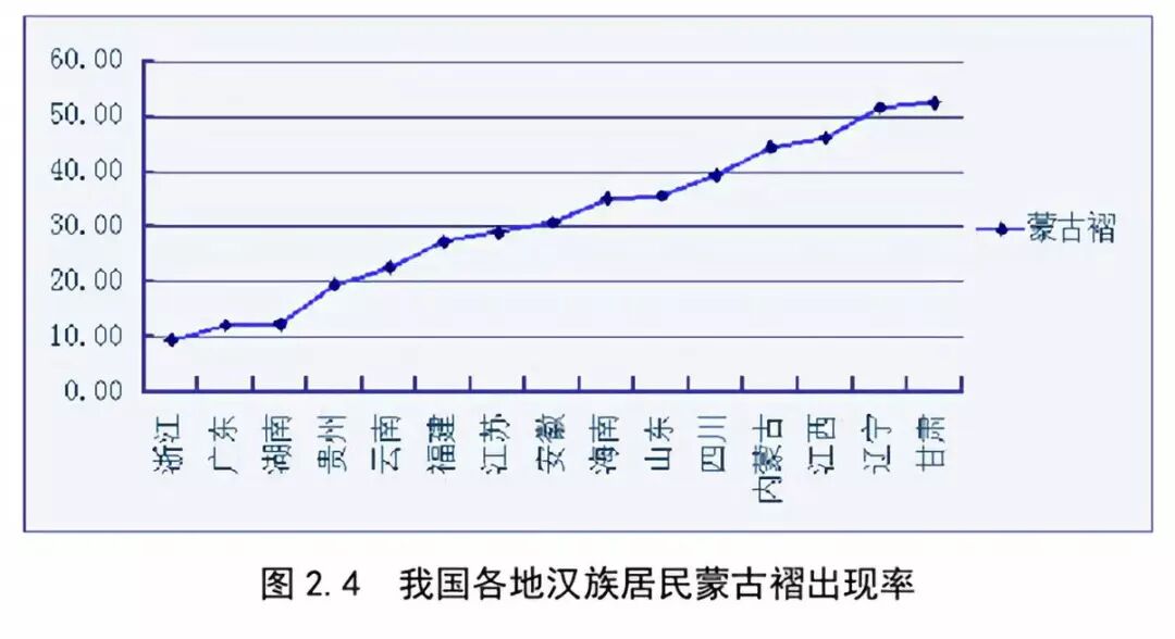 巧合的是,中国南方人的眼睛真比北方大一些。2009年到2011年,在面向11792例中国南北方汉族人的面部形态学测量分析中,除开江西,内眦赘皮(蒙古褶)的出现率的从北至南逐渐减少,也就是越往南边,越少被包住眼角的。