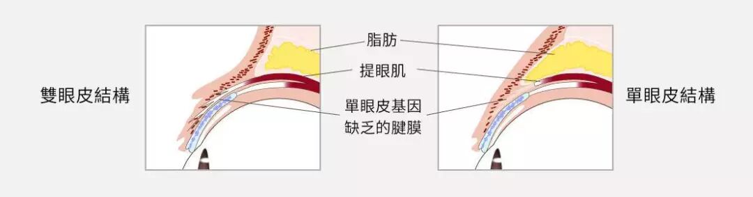 但50%的亚洲人的腱膜长到睑板前就打住了,成了单眼皮。和欧洲人相比,亚洲人腱膜上的脂肪团不仅长得多,位置很低。这部分一厚,直接意味着上眼皮子更容易向外凸起,变成俗称的“肿泡眼”。