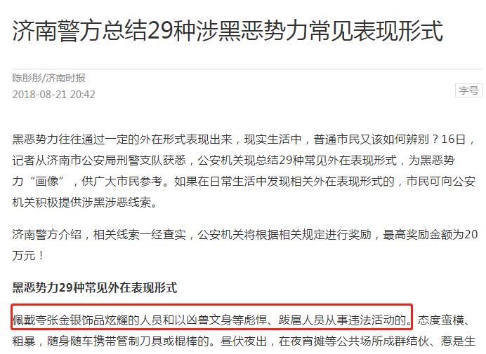 话说,前一阵子济南警方发布了一条人民群众喜闻乐见的总结,认为涉黑势力通常通过一定的外在形式表现出来,其中一个表现就是,佩戴夸张的金!银!饰品!