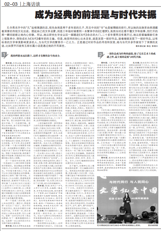孔令燕名字中的“孔”追根溯源的话,祖先自然是两千多年前的孔子,而且中间的“令”也是被赐续的排行,所以她的血脉里自然埋藏着深厚的传统文化功底。提起自己的文学启蒙,则是三年级时候看到一本繁体字的《红楼梦》,虽然当时还看不懂文字和故事,但打开的那一瞬间就能让她内心安静。