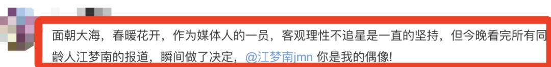 还有人说:“不追星是一直的坚持,但今晚,我做了决定,江梦南,你是我的偶像。”