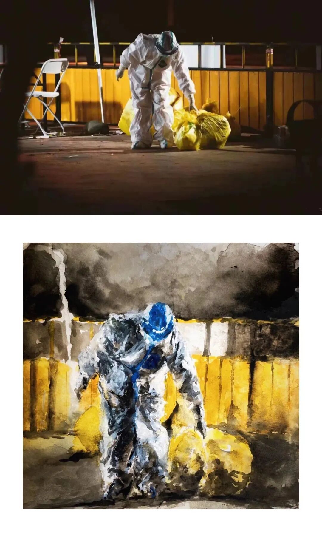 “疫情防控期间,一天早上,我在‘上海嘉定’公众号上看到了一张照片,照片中一个穿着防护服的医护工作者在黑夜里整理医疗废弃物,白色的防护服和黄色的垃圾袋在深色的背景中非常显眼,我一下子就被触动到了。