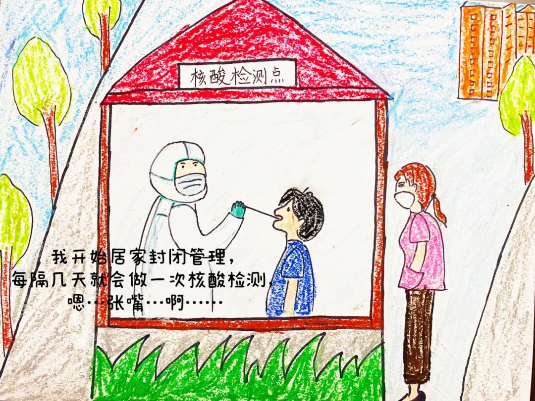 二年级14班的同学们集体创作了连环画《早日回家》,三(2)班王颢珺同学创作了连环画《逆行者》,三(4)班杜翛然同学也用连环画《花开了》讲述了自己一家在小区做核酸的小故事。