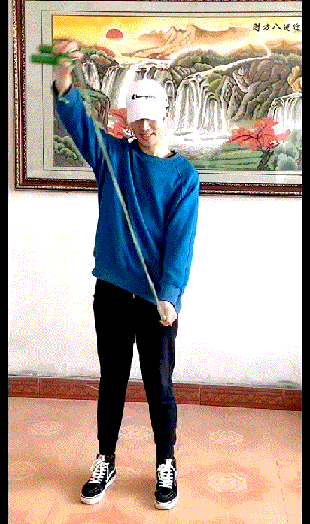 2.两手拉直绳子向身体后上方,依次经过头、颈、背翻转到身体后方最大幅度保持3s.