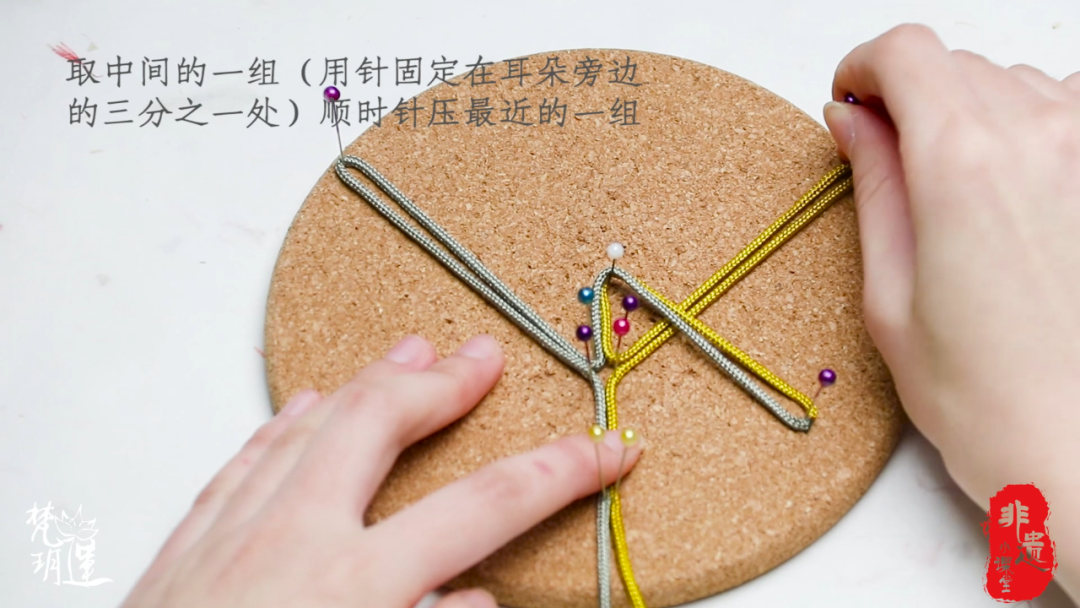 步骤三:取中间的一组(用针固定在耳朵旁边的三分之一处)顺时针压最近的一组,并依次压过来
